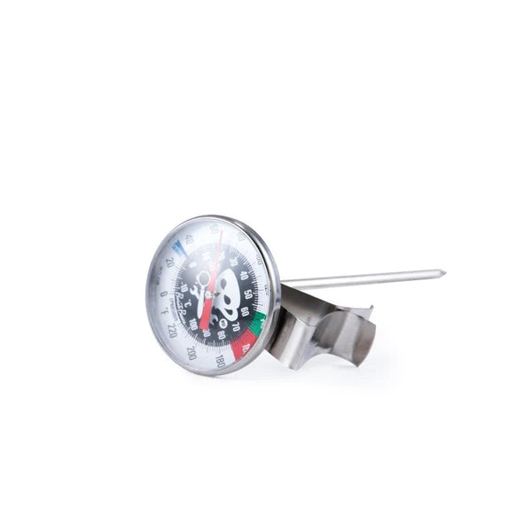 This high-quality milk frothing thermometer simplifies steaming by giving you the means to track the temperature of the milk. Train new baristas to find the perfect temperature or use it to ensure consistent accuracy in your own drinks. This thermometer by Barista Basics is adjustable and can be easily calibrated to ensure long-term precision. Clips onto frothing pitchers for optimal control and perfect for 12oz frothing pitchers.